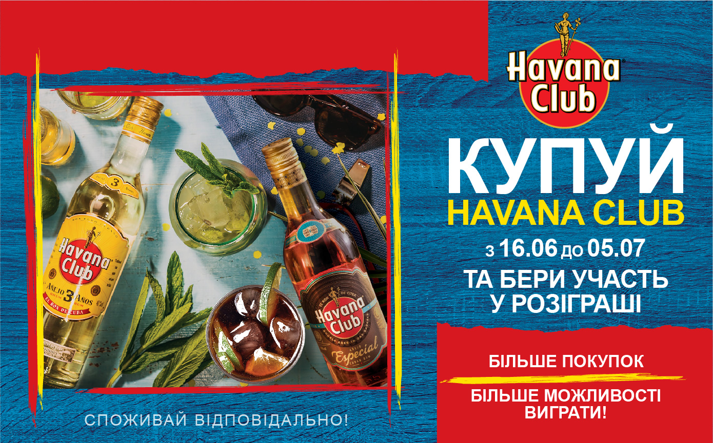 - Покупайте с 16.06.20 по 12.07.20 на сайте alcomag.ua любой Ром Havana Club кроме объема 0,05 л.