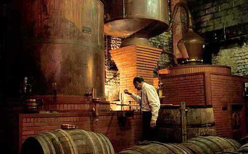 На наступному етапі вино перетворюватиметься на міцний спирт. Напій поміщають у аламбики – спеціальні перегінні куби з міді, матеріалу, стійкого до окислення та з гарною теплопровідністю. Перегонку проводять двічі, весь цей процес триває приблизно добу. При цьому виробник повинен закінчити цей процес до 31-го березня року, який прямував за роком збирання врожаю.